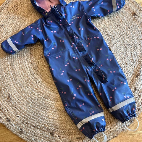 Alaosa kurakangasta. Sininen. Hieman paksumpi vuori. Kurakangas hieman ryppyinen, mutta pitää vettä ja muuten hyväkuntoinen ja ehjä haalari.