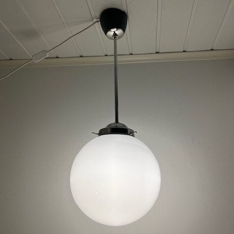 Myydään uusi, käyttämätön Riippuvalaisin , jossa kromattu runko ja kupu aitoa lasia , pidin e27 , johto kangaspäällysteinen , pituus max. 125cm , kuvun korkeus 23cm ja halk. 22cm