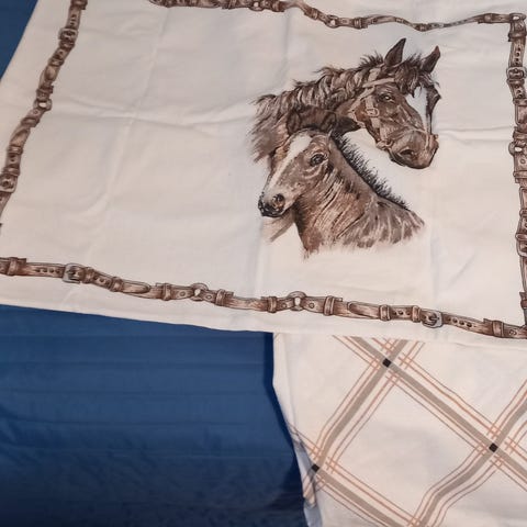 Kaunis normaalikokoinen vintage pussilakanasetti, aiheena hevonen. Melko paksua kangasta, kuvitus sama molemmilla puolilla. Ihana pussilakana vaikka hevostytölle.
