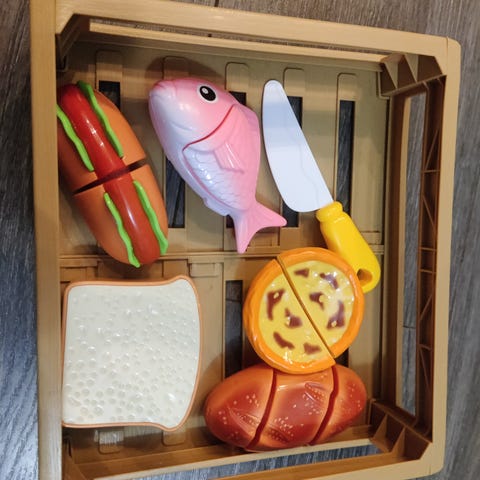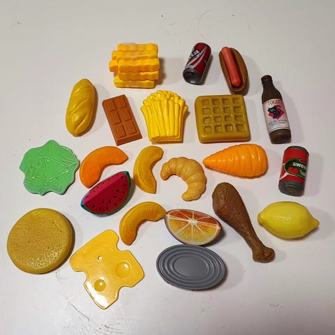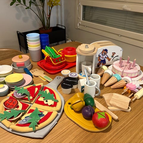 Ruokaleluja, puuta, pehmoa, muovia.