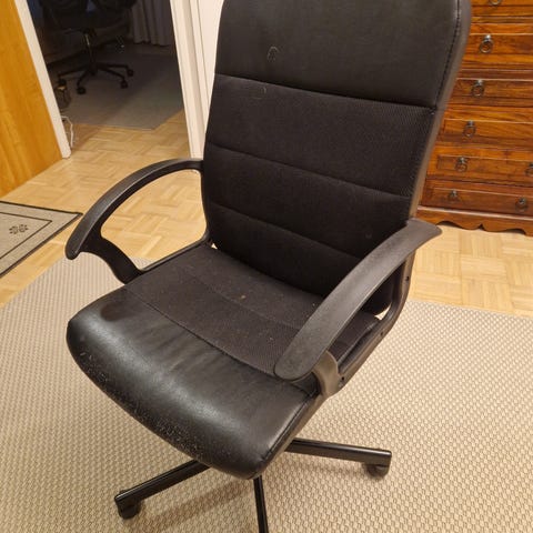 Toimistotuoli harmaalla kangaspäällysteellä ja mustilla muovikäsinojilla. Säädöt toimivat. Käsinojien pehmusteet ovat pahasti kuluneet. Ne kannattaa ehkä poistaa kokonaan. Pieni puhdistus voi myös olla paikallaan.