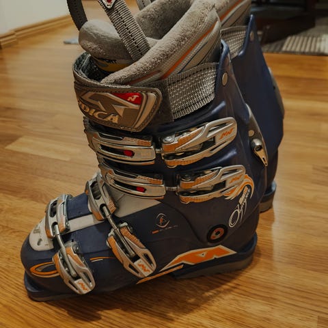 Nordica NF 5 laskettelumonot. Kokomerkintä on 240-245, ulkomitta 285, mutta ovat minusta pienemmät, ehkä ennemmin 235 eli n. 36-36,5 -kokoiseen jalkaan sopivat.
