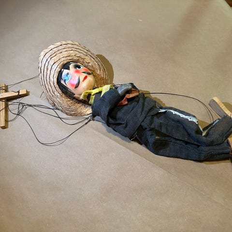 Puisesta materiaalista valmistettu Pinocchio-narunukke, jossa punainen puku ja mustat kengät. Nukke on liikkuva narun avulla. Isohko n, 30 cm arvio pituudesta