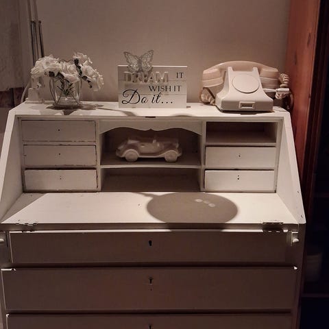 Myydään ylimääräiseksi jäänyt kaunis valkoinen vanha klaffilipasto jossa kirjoituspöytä.