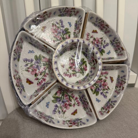 Kirkas iso tarjoiluvati/kakkuvati, jalallinen, ehjä, alkuperäisessä laatikossa. Vatiosan halkaisija n. 36 cm, korkeus 8,5 cm. Vain nouto, saattaa kulkeutua omien menojen mukaan Kouvola-Kuusaa-akselille. Mmm.