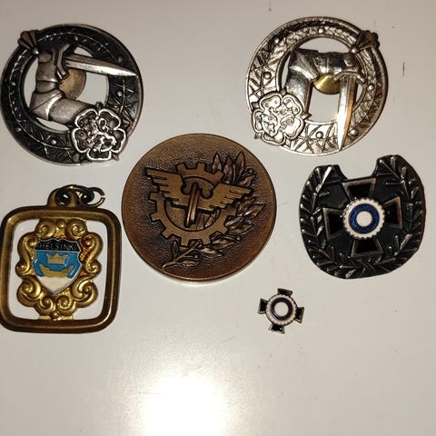 Erä sotilasmerkkejä. Tunnistettu mm. Stoavammaismerkki 1939-1945, Mestarikurssin ruuvimerkki, Päällystöopiston merkki, Sotainvalidien merkki (kiveen tms., josta syystä ei ruuvia), Tammenlehvä 2000. Nouto Porvoon Huhtisesta tai postitus (5,50 €).