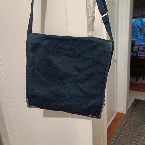 Marimekon pieni olkalaukku. Musta, hopeanvärisillä klipseillä. Markiisikangasta, Suomessa valmistettu. Hihnan pituus 127 cm.
