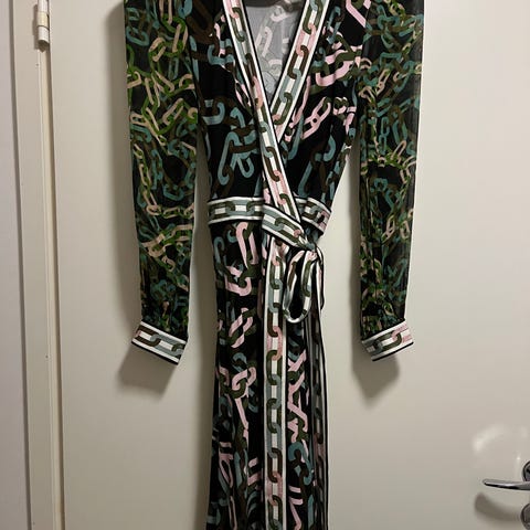 Diane von Fürstenberg juhlamekko, koko S, musta. Mekon mustan keskiosan materiaali on villa. Mekossa on läpikuultavat hihat, joissa koristeellinen kullan värinen lehtikuvio, tämä osuus silkkiä.