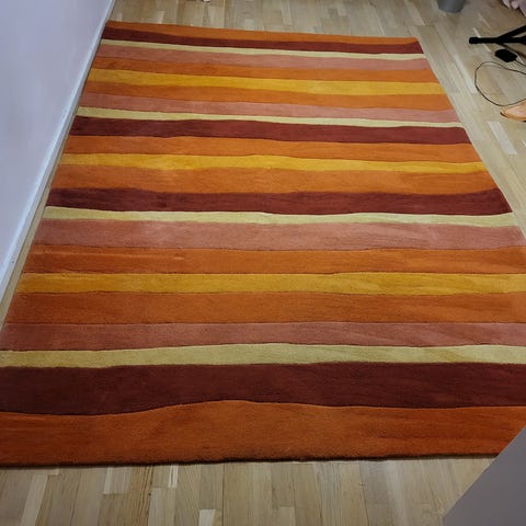 Koko 200x250cm. Jämäkkä matto, kantattu. Pesty tekstiili-imurilla, muutamia läikkiä kuitenkin näkyy, muuten ehjä.