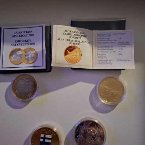Metallinen kolikko, jossa teksti 'Hyvää Uutta Vuosisatahaastetta 2000' ja 'Gott Nytt Århundrade 2000'.
