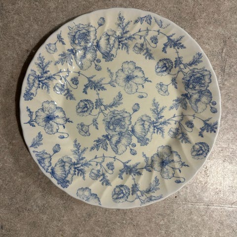 Keittolautasia enemmän käytetty. Yhdessä keittolautasessa näkyy särö ei ole rikki ja pystyy käyttämään. Pieni pala puuttuu myös yhden lautasen reunasta. Kuva.