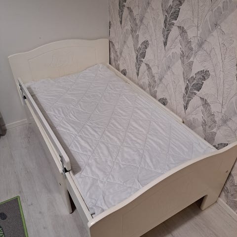 Sänky on jatkettava, nukkumapituudet 100-190cm ja leveys 73 cm. Mukaan saat jatkopalalla varustetun patjan, joka on lähes uudenveroinen: siisti, hajuton, tahraton ja vain 6kk ollut käytössä, uutena maksaa Prismassa 75€