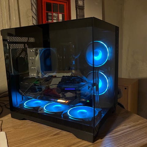 MSI pelitietokone, jossa RGB-valaistus. Tietokone on suunniteltu pelaamiseen ja sisältää tehokkaat komponentit. Kotelo on varustettu tuulettimilla ja läpinäkyvällä sivupaneelilla, joka mahdollistaa sisäosien näkyvyyden.