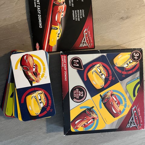 dominopeli, jossa yhteensä 28 kpl dominopalikoita. Palikoista on Disney Pixar -elokuvista tuttuja hahmoja kuten Salama McQueen. Peli kehittää havaintokykyä ja motorisia taitoja, ja sopii usein jo yli 3-vuotiaille. Pelin tavoite on päästä eroon kädessä olevista palikoista yhdistämällä samat kuvat toisiinsa. Kaikki palikat tallella. Metallirasia on vähän kolhiintunut ja muutaman palikan kuvassa on hieman haalistumaa (kts. viimeinen kuva). Nouto tai postitus (kulut ostajalle).