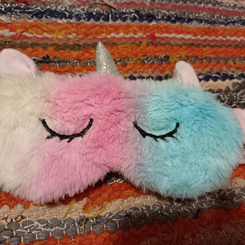 Suloinen yksisarvinen unimaski. Toiselta puolelta samettia, toiselta satiinia.