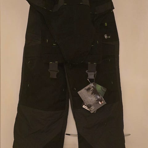 Haalarissa läpällinen rintatasku (jossa JOBTEX-merkki) sekä takatasku selkäpuolella.
