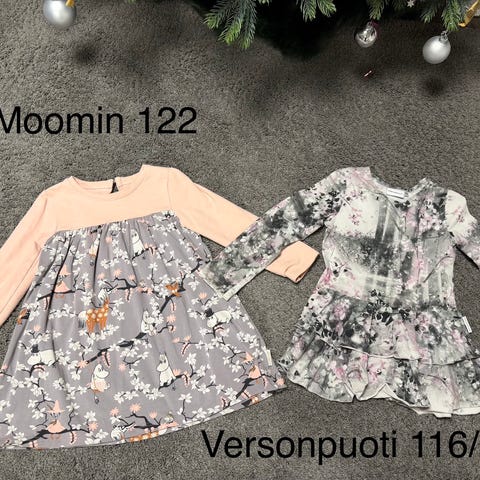 Tyttöjen mekkopaketti. Muumi- ja mansikkamekko ovat kokoa 116 ja näitä ei juurikaan ole pidetty. Me&i:n mekko kokoa 10/116 ja ollut käytössä. Siinä edessä pieni tahra ja se näkyy kuvissa. Meillä koiria.