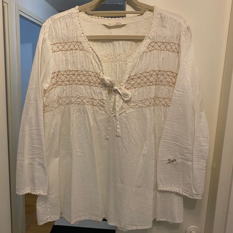 Odd Mollyn valkoinen Remix Blouse. Koko 4/xl, vastaa noin kokoa 44. Yläosasta istuva, alaosa erittäin väljä ja ilmava. V-kaula-aukko, jossa valkoiset pitkät satiininauhat, jotka saa rusetille. Hihan yläosassa kirjailtu logo. Kunto erittäin hyvä: ehjä, tahraton, ei kulumia. Ei kellastumista kainaloissa. Ovh. 140€.