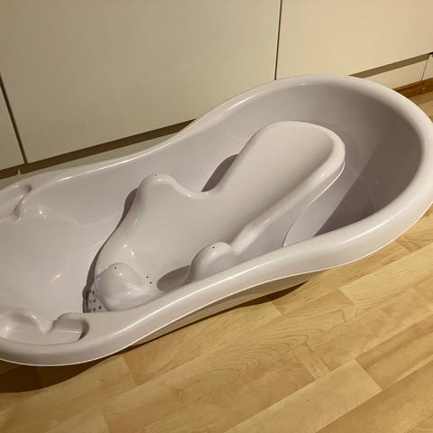 Vauvan (0-9kg) kylpytuki ja kylpyamme, jonka mitat n. 84*49*30cm. Kylpyammeen pohjassa tulppa, josta vedet voi laskea pois.