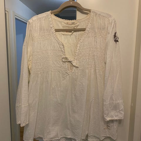 Odd Mollyn valkoinen pusero (malli muistaakseni Remix Blouse). Rypytetyssä osassa lanka vaaleanruskea. Koko 4/xl, vastaa noin kokoa 44. Yläosasta istuva, alaosa erittäin väljä ja ilmava. V-kaula-aukko, jossa satiininauhat, jotka saa rusetille. Hihansuussa ommeltu satiinirusetti. Kunto erittäin hyvä, on ehjä ja tahraton. Ei kellastumista kainaloissa. Toisessa kainalossa yksi vaaleanruskea lanka katkennut. Ovh. 140€.