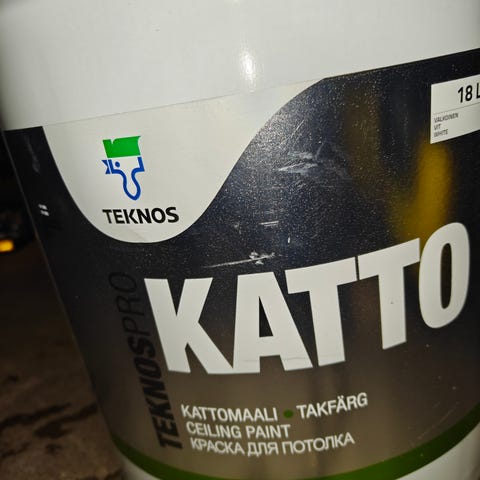 Teknos Paneelikattomaali 2,7 litran purkki josta käytetty arviolta 0,5 litraa. Lähes täysi siis!