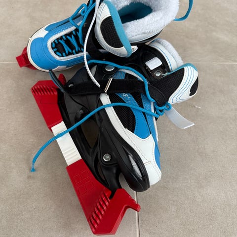 Graf lasten luistimet. Luistimissa on pohjassa säädettävä osa, eli nämä sopivat 31-34 kokoiselle jalalle. Ovat myös normaalia lämpimät kun edessä on myös paksuhko lämpökerros. Terät ovat hyvässä kunnossa. Karvavuori ylhäällä paikoitellen kulunut.
