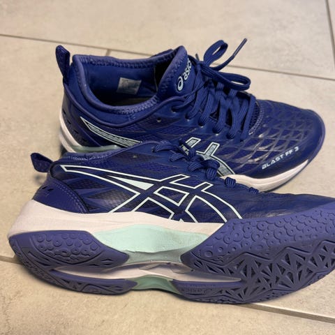 Asics Gel-dedicate 8 sisäpelikengät, koko 35, sininen väri. Olleet käytössä yhden kauden salibandyssa. Hyvät ja ehjät, kärjissä hyvin pieniä kulumajälkiä (kuvassa). Pirkkalassa, vain haku.