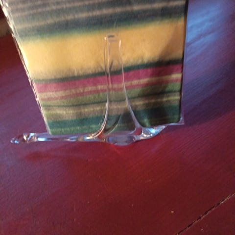 Metallinen lautasliinateline. Korkeus 12 cm, pituus 13 cm ja leveys 6 cm.
