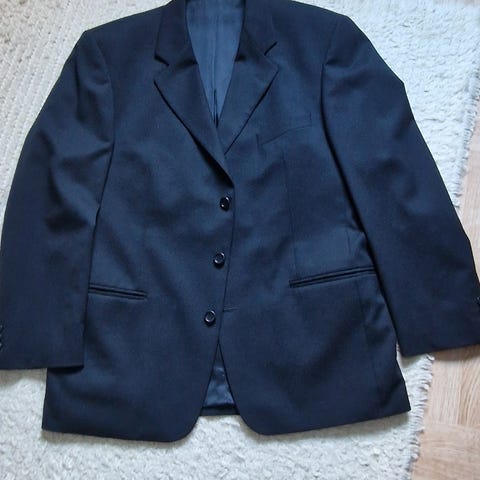 Tummansininen Taylor Design -miesten puvun takki koko 54. 55% polyesteria, 45% villaa. Vuori 100% viskoosia. Kuvissa takki eri valaistuksissa, jolloin näyttää joko tummemmalta tai vaalemmalta.