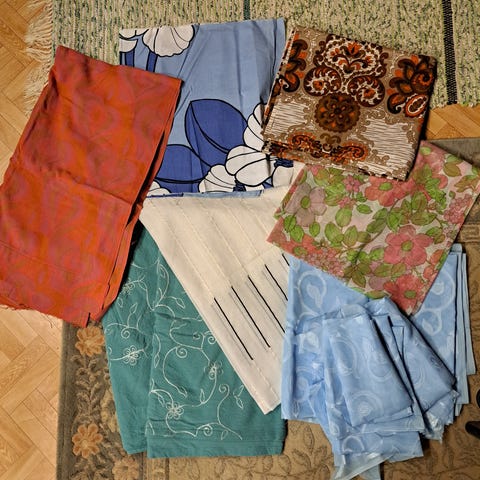 Vanha siisti verho / kangas, vain yksi kappale. Verhon korkeus on 180cm, yläreunassa tankokuja. Leveys 121cm.