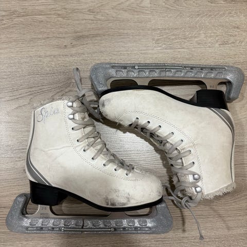 Lasten luistimet koko 35. Käyttökelpoiset ja muuten ehjät, molempien luistinten pinnassa murtumaa (kuvassa), ei kuitenkaan läpi asti. Ei haittaa käyttöä.