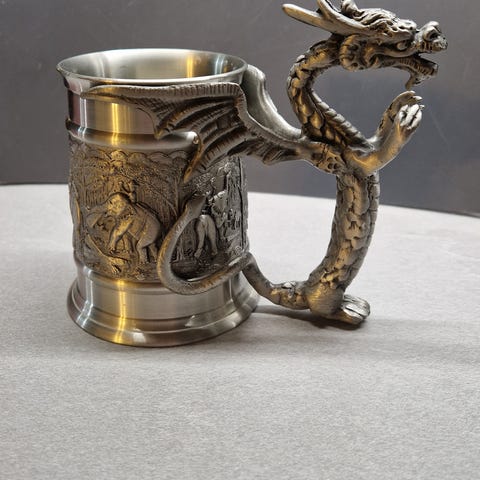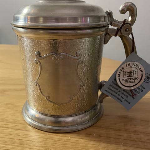 Kaksi hyväkuntoista tinatuoppia. Toinen ilmeisesti Karl Laineen Revontulituoppi ja toisesta ei ole tietoa. Revontulituopissa ei ole leimoja ja toisessa tuopissa on. Molemmat yhteishintaan 25e.