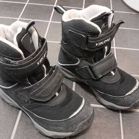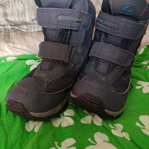 Viking lasten vedenkestävät talvikengät, koko 31. Kunto hyvä, ei kulumia muuten kuin logoissa/goretex-teksteissä. Tarrat pitävät vielä hyvin. Väri tummansininen. Kuvissa näkyy pientä likaa.