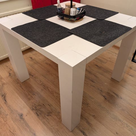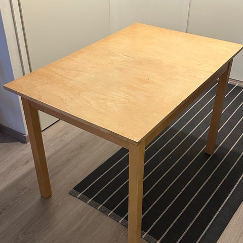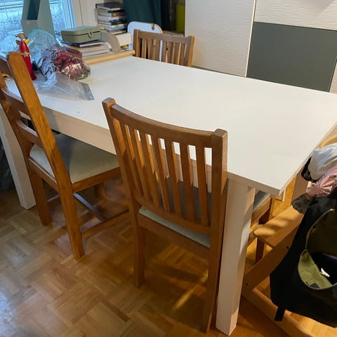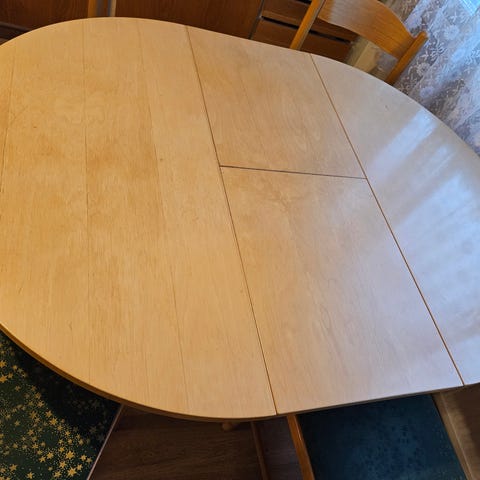 Jatkettava ( kaksi irrallista jatkopalaa), tukeva ruokapöytä. Pöydän pinnassa jonkin verran elämisen jälkiä.