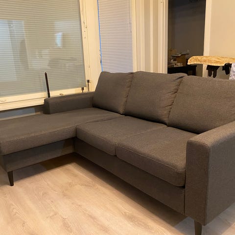 Kolmen istuttava tummanharmaa divaanisohva. Ostettu Nokian Divaanista 5v sitten. Kangas ok kunnossa, ei tahroja, mutta sohva ei ole uusi.