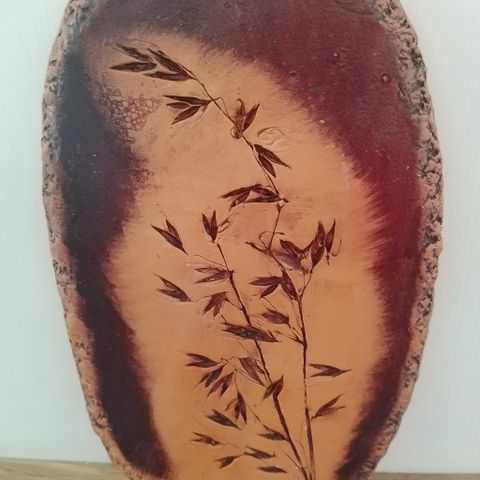 Käsintehty taulu, jossa käytetty kivi- ja hiekka-aineksia. Taulun koko on noin 30 x 30 cm. Kuvassa näkyy maisema, jossa on punainen puu, musta maa-alue ja sininen vesialue. Taulu soveltuu seinäkoristeeksi.