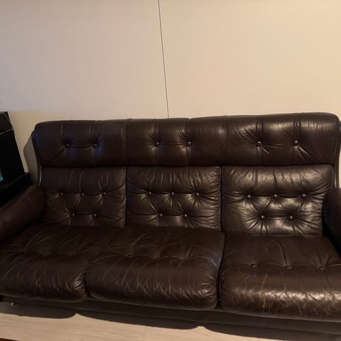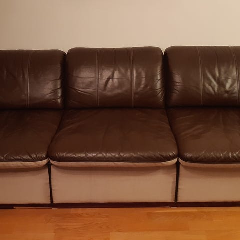 3-4 vuotta käytetty sohvakalusto, minkä jälkeen ollut varastoituna lämpimässä autotallissa. Kuvassa näkyvää korjausta lukuunottamatta muuten ehjä kaikin puolin.