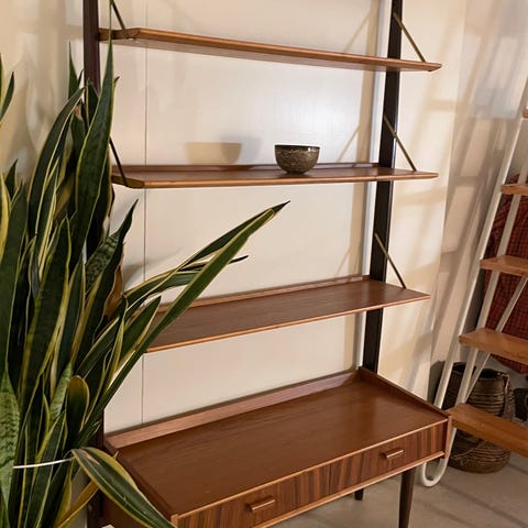 Vintage teak hyllykkö vitriinillä