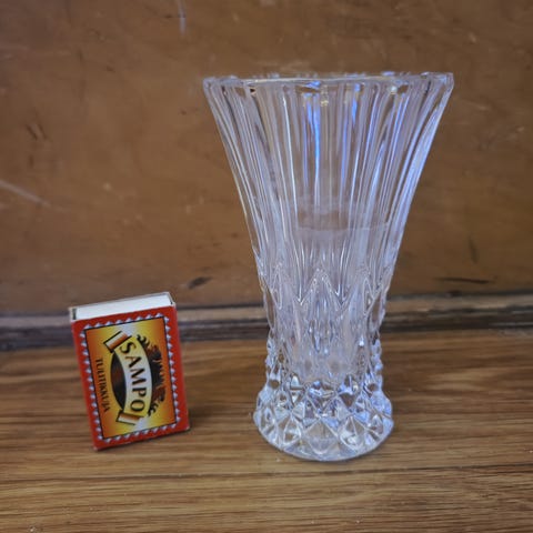 Myydään pieni lasimaljakko, ehjä ja siistikuntoinen.