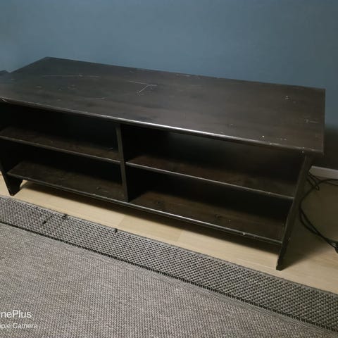 TV-taso musta, kulmamalli. Huonekalu on suunniteltu sijoitettavaksi kulmaan ja siinä on lasiovellinen säilytystila keskiosassa.