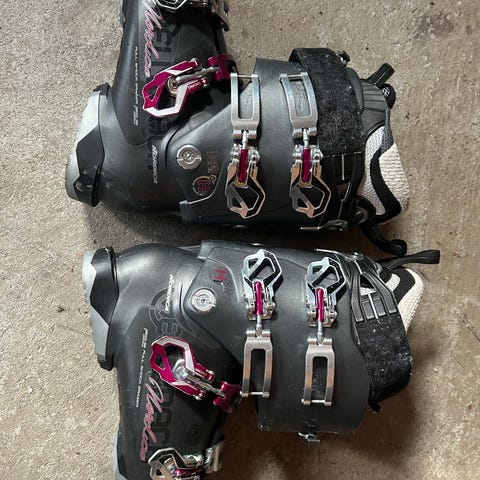 Kaluston vähennyksen yhteidessä seuraavalle laskettelumonot koossa 260-265. Omaan jalkaan käy yleensä 41-koon kenkä ja nämä on oleet hyvät. Väri musta ja harmaa, neljän soljen kiinnitys, pehmeä sisävuori.