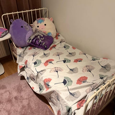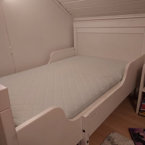 Jatkettava sänky lasten huoneeseen. Sänky on valkoinen ja sen pituutta voi säätää lapsen kasvun mukaan. Sopii erikokoisille lapsille ja tarjoaa käytännöllisen ratkaisun lapsen nukkumiseen.