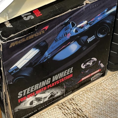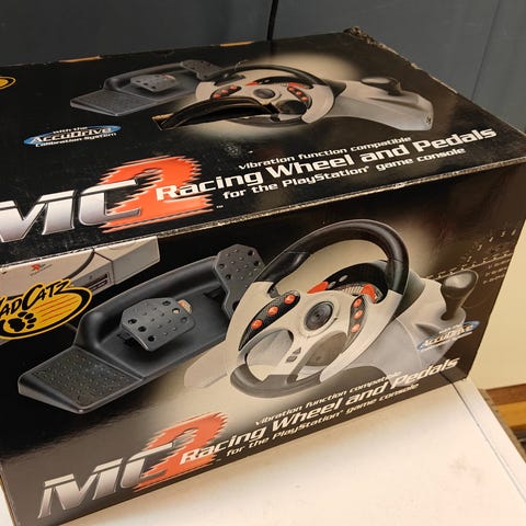 Kuvissa näkyvä rattiohjain. Langaton yhteys ohjaimen ja konsolin välillä, toimii kolmella AA-paristolla. Kokeiltu joskus PS2:n kanssa mutta muuten on ollut käyttämättömänä. Kiinnittyy imukupeilla pöytään, voi myös pitää sylissä kun käyttää kolmannessa kuvassa näkyviä ohjaimen pohjaan kiinnitettäviä läpysköitä.