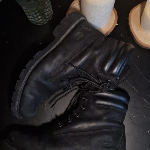Mustat nahkasaapikkaat, joissa tukevat kumipohjat ja tekstiilivuori. Korko n. 6 cm. Mukavat kävellä, kenkien sisällä pehmeä Ortholite-pohja. Siisti, käytetty kunto. Postitus onnistuu.