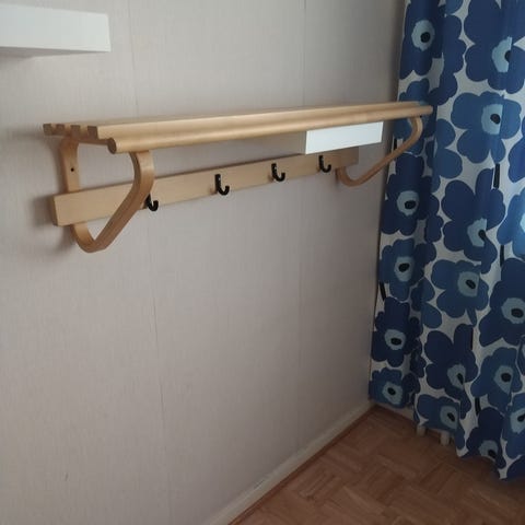Artekin vaatenaulakko 160 on samaan aikaan käytännöllinen ja yksinkertaisen tyylikäs. Naulakon yläosan puut ovat alaosaa pidempiä, joten naulakkoon ripustetut vaatteet pysyvät kätevästi järjestyksessä. Sisustusarkkitehti Anna-Maija Jaatinen suunnitteli aikaa kestävän naulakon.