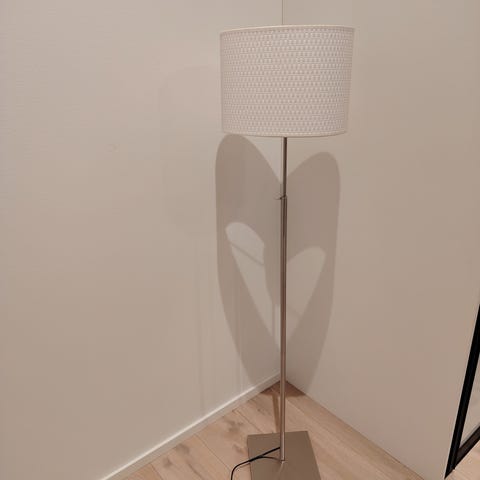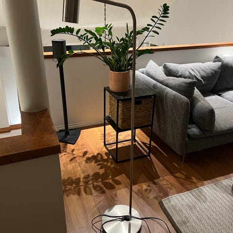 Hyväkuntoinen musta jalkalamppu säädöillä.