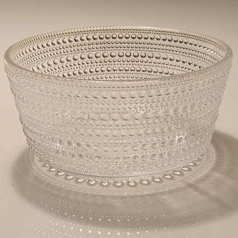 ” Iittalan Kastehelmi-kulho kuuluu Oiva Toikan vuonna 1964 luomaan lasikokoelmaan. Pienillä lasisilla helmillä koristeltu kulho hurmaa aavikon sävyllään. Kastehelmi-kulho sopii jälkiruoka- sekä tarjoilukulhoksi ja viimeistelee niin arjen kuin juhlankin kattauksen.”