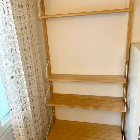 Ostettiin tämä Ikeasta silloin, kun sarja oli poistumassa ja kaapin päälle tulevia kapeampia hyllylevyjä ei enää ollut saatavilla. Olemme itse sahanneet hyllyt sopivaan mittaan. Tämä tarkoittaa sitä, että kapeampien hyllyjen edestä katsottuna vasemmalla puolella on reunassa sahausjälki. Jos tämä reuna tulee seinän viereen, sitä tuskin huomaa. Laitoin kuvan hyllyn reunasta lisäkuviin.
