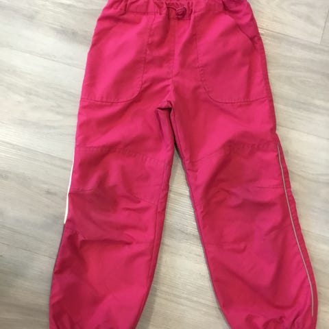 Myydään tyttöjen vaaleanpunaiset välikausihousut (Mywear, koko 122). Lahkeissa heijastavia yksityiskohtia.