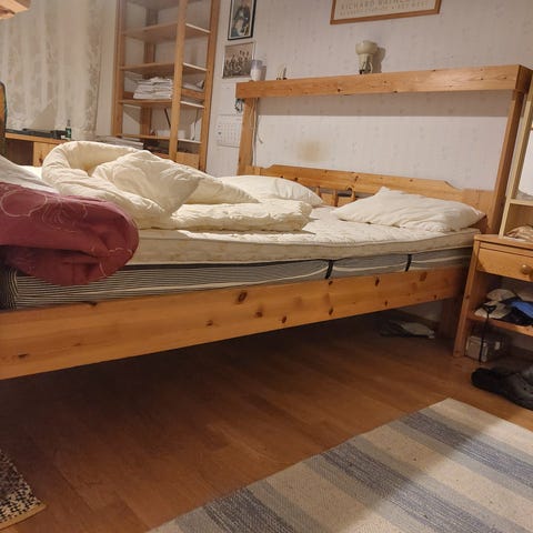 Annetaan vuonna 2020 Maskusta ostetut jenkkisängyn rungot (2kpl). Runkojen jalat ovat puuta. Kunto yleisesti siisti, runkojen kyljissä näkyvissä pientä painaumaa (näkyy 4. kuvassa).